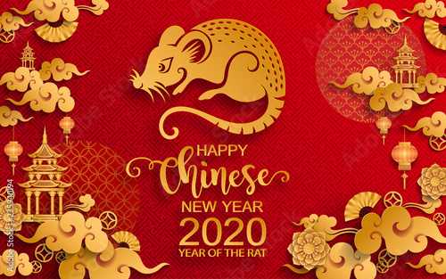 Happy Chinese New Year 2020 Zodiac Sign With Gold Rat Paper Cut